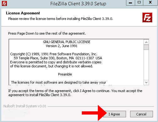 3. The FileZilla Client will show a License Agreement. Please read it and accept the agreement to install the FileZilla Client on your PC.