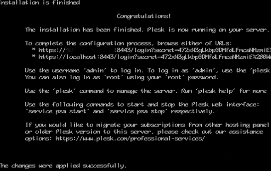 Once Plesk is installed, it will display a congratulations message with your Plesk control panel URL.