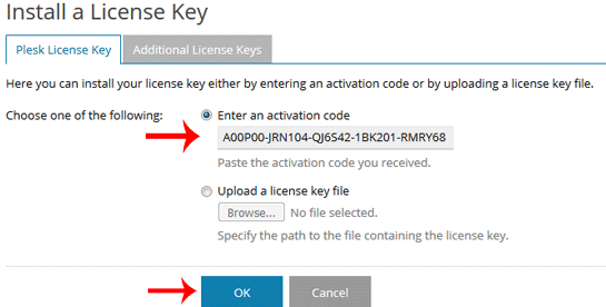 Step 4: Under Select your license type, should you have a license key, enter your Plesk Onyx license key or use a trial license by choosing Proceed with a full-featured trial license.