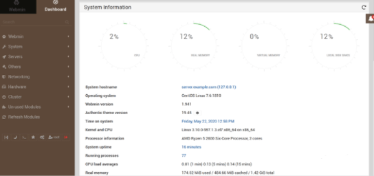 The Webmin Dashboard will open. The New Design of WebMin looks nice.