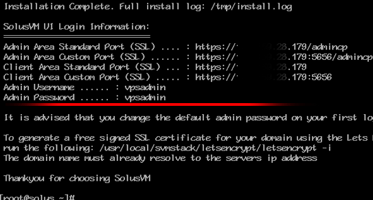 Note: Don't forget to change your default username and password for SolusVM. The default username/password is not secure, and it is easy for anyone to access your panel with them.
