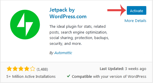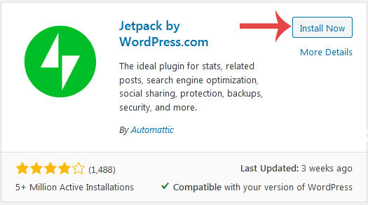 4. The available plugins matching the keyword Jetpack will appear. Click on the Install button, which appears next to the plugins name.
