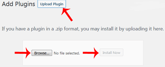 3. Click on Upload Plugin and then on Browse. Chose your plugins zip file and then click on Install Now.