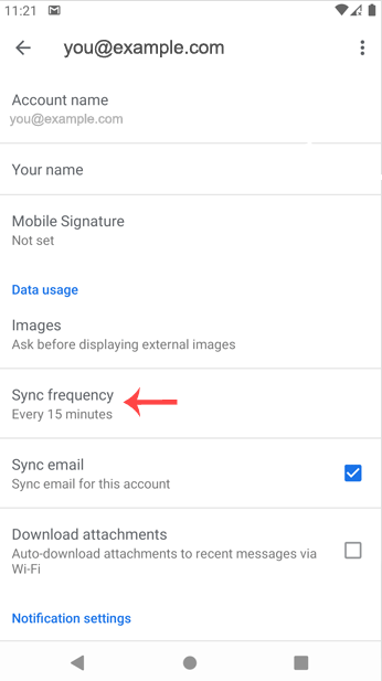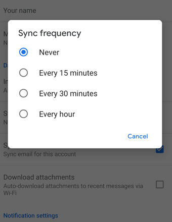 5. Set your frequency to 15 minutes or any custom time. If you do not wish to sync email automatically, set it to Never. This will require you to sync the emails manually.