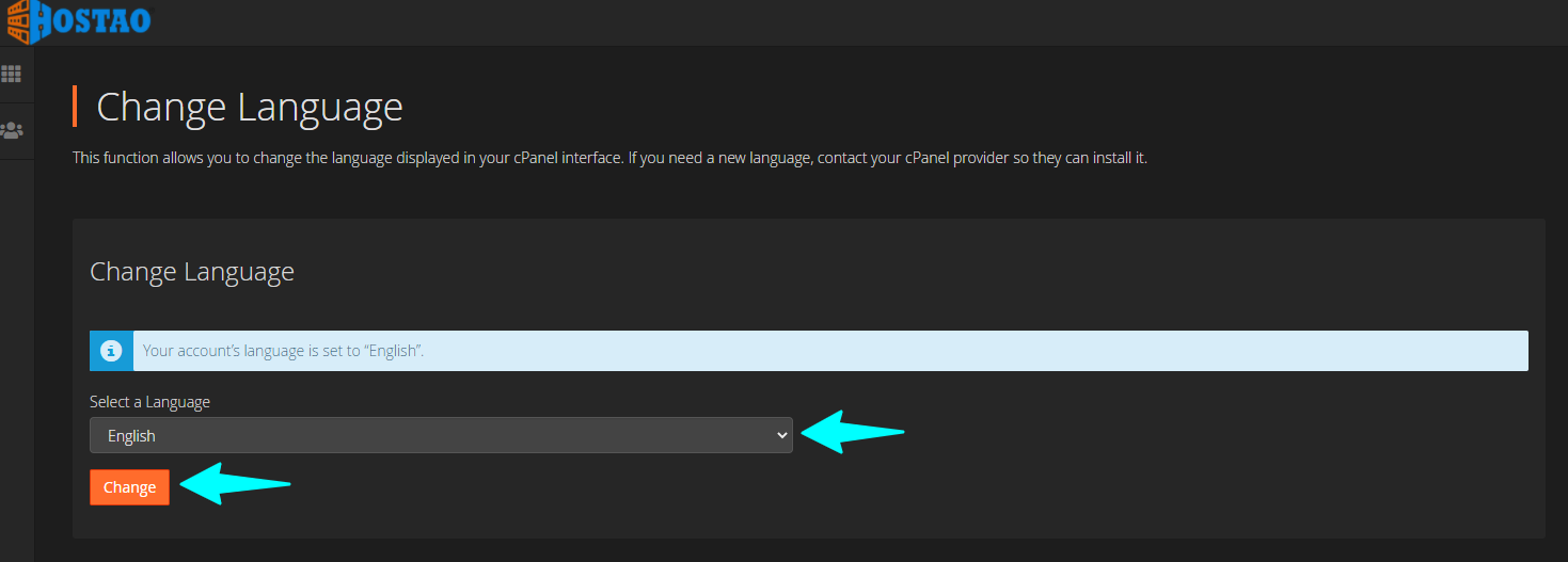3. From the cPanel Language Configuration Page, choose your language from the dropdown menu and click on the Change button.