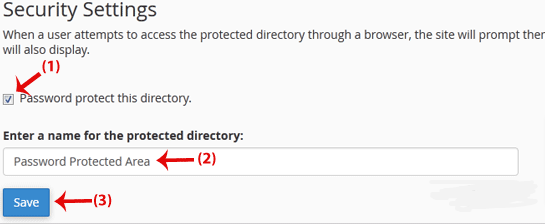 5. Under Security Settings, check the box next to the Password protect this directory and enter a name for the protected directory like Password Protected Area. Then click the Save button.