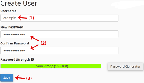 7. Scroll down the page and under Create User fill in the username and password fields or use the Password Generator option to generate a new random password and copy the user/password to a notepad. You will need this when you want to open your password-protected directory and click on the Save button.