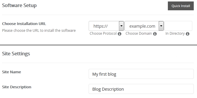 - Choose Installation URL: Choose the appropriate protocol/domain. Inside the "In Directory" field, should you want to install this in a directory, i.e. example.com/directory, enter the directory name. Otherwise, leave it blank to install in your main domain, i.e. example.com