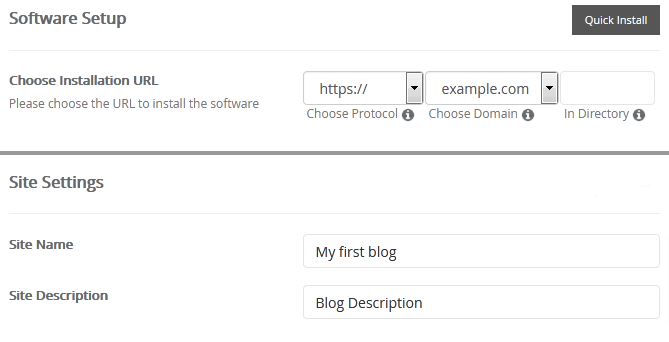 - Choose Installation URL: Choose the appropriate protocol/domain. Inside the "In Directory" field, should you want to install this in a directory, i.e. example.com/directory, enter the directory name. Otherwise, leave it blank to install in your main domain, i.e. example.com