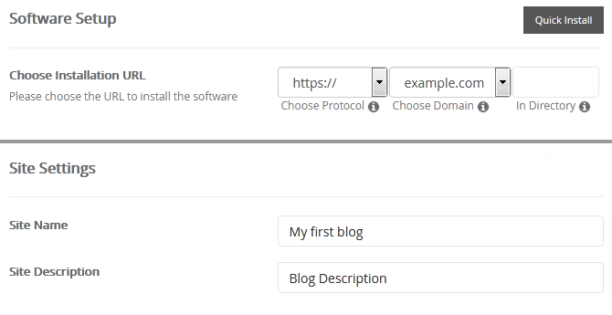 - Choose Installation URL: Choose the appropriate protocol/domain. Inside the "In Directory" field, should you want to install this in a directory, i.e. example.com/directory, enter the directory name. Otherwise, leave it blank to install in your main domain, i.e. example.com