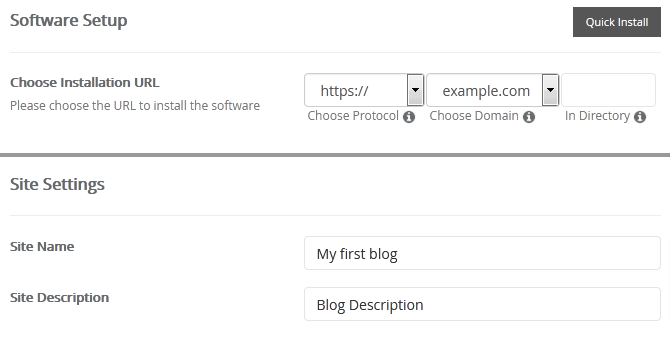 - Choose Installation URL: Choose the appropriate protocol/domain. Inside the "In Directory" field, should you want to install this in a directory, i.e. example.com/directory, enter the directory name. Otherwise, leave it blank to install in your main domain, i.e. example.com