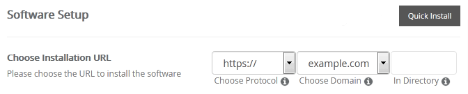- Choose Installation URL: Choose the appropriate protocol/domain. Inside the "In Directory" field, should you want to install this in a directory, i.e. example.com/directory, enter the directory name. Otherwise, leave it blank to install in your main domain, i.e. example.com