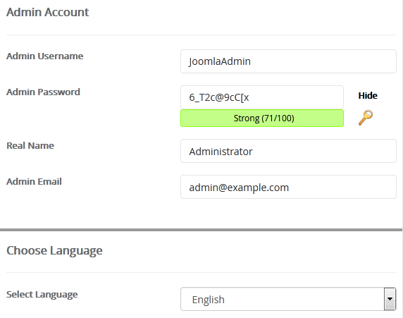 - Admin Username: Your new Joomla username (for security reason do not use the Administrator or the Admin username.)