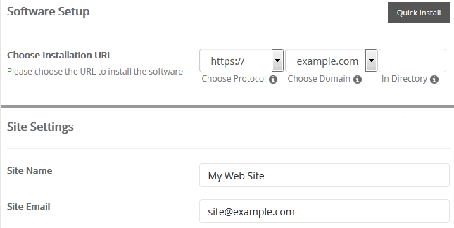 - Choose Installation URL: Choose the appropriate protocol/domain. Inside the "In Directory" field, should you want to install this in a directory, i.e. example.com/directory, enter the directory name. Otherwise, leave it blank to install in your main domain, i.e. example.com