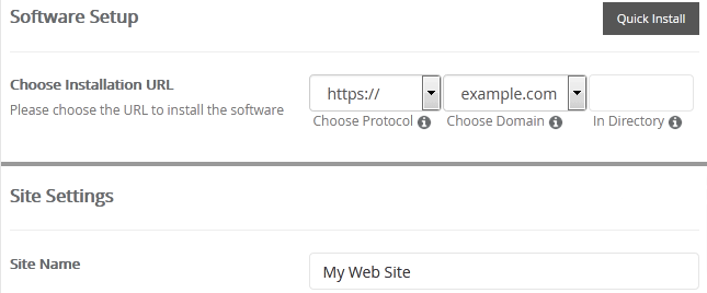 - Choose Installation URL: Choose the appropriate protocol/domain. Inside the "In Directory" field, should you want to install this in a directory, i.e. example.com/directory, enter the directory name. Otherwise, leave it blank to install in your main domain, i.e. example.com