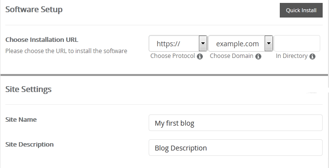 - Choose Installation URL: Choose the appropriate protocol/domain. Inside the "In Directory" field, should you want to install this in a directory, i.e., example.com/directory, enter the directory name. Otherwise, leave it blank to install in your main domain, i.e., example.com