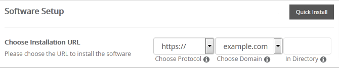 - Choose Installation URL: Choose the appropriate protocol/domain. Inside the "In Directory" field, should you want to install this in a directory, i.e., example.com/directory, enter the directory name. Otherwise, leave it blank to install in your main domain, i.e., example.com