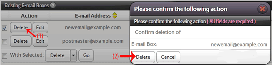 4. Under the Existing E-mail Boxes tab, select the appropriate E-mail address you wish to remove and then click on the Delete button.