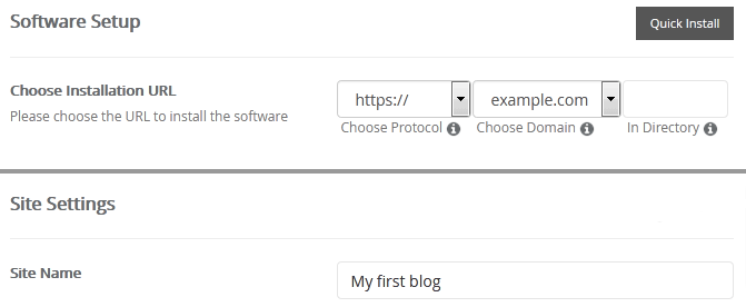 - Choose Installation URL: Choose the appropriate protocol/domain. Inside the "In Directory" field, should you want to install this in a directory, i.e. example.com/directory, enter the directory name. Otherwise, leave it blank to install in your main domain, i.e. example.com