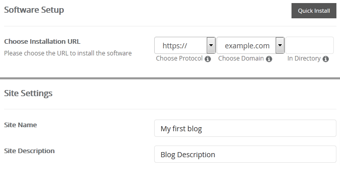 - Choose Installation URL: Choose the appropriate protocol/domain. Inside the "In Directory" field, should you want to install this in a directory, i.e. example.com/directory, enter the directory name. Otherwise, leave it blank to install in your main domain, i.e. example.com