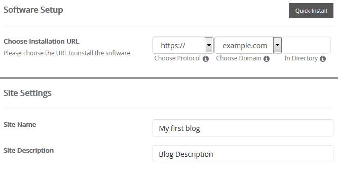 - Choose Installation URL: Choose the appropriate protocol/domain. Inside the "In Directory" field, should you want to install this in a directory, i.e. example.com/directory, enter the directory name. Otherwise, leave it blank to install in your main domain, i.e. example.com