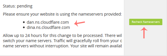 After updating your domain nameserver, Wait for a few hours, log in again to your Cloudflare account, and click on Recheck Nameservers.