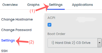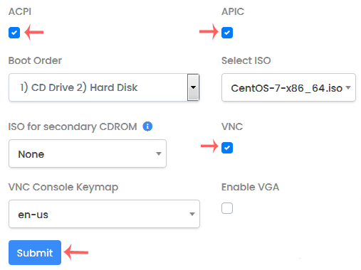 Virtualizor allows you to enable or disable VNC, APIC, and ACPI.