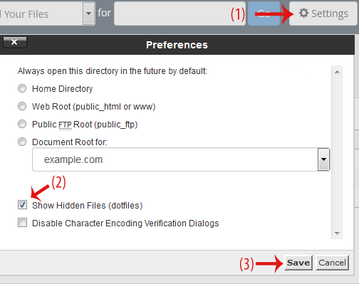 5. If the .htaccess file does not show, click on the Settings button in the File Manager. You can find the Settings button on the Right Side of the top menu. A new small window will open. Mark the Show Hidden Files (Dotfiles) option and click on the Save button. You will be able to see the .htaccess file. If it does not exist, create a new one.
