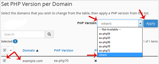 3. Scroll down to the end of the page, select your domain from the left side, and see the PHP Version option. With a drop-down on the right side. Select the inherit option from the drop-down menu and click the Apply button.