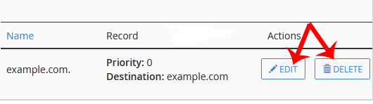 5. Locate MX Record you wish to edit or remove. Should you wish to edit an MX record, click the Edit option, modify the details, and click on Save Record. Removing a record can be done with the Delete option.
