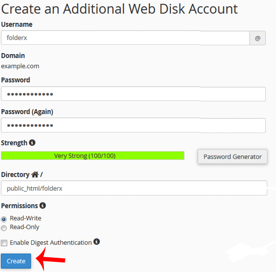 4. Now click on the Create button, and your new additional account will be created. You can use your new login details to access your Web Disk.