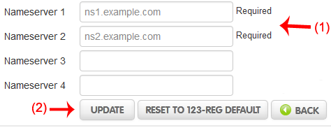 5. Enter your Nameservers in field 1 and field 2 and click on Update.