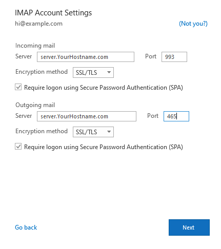 5. Enter IMAP details as provided below the screenshot but change the hostname to your server hostname and make sure that your IMAP port is correct.